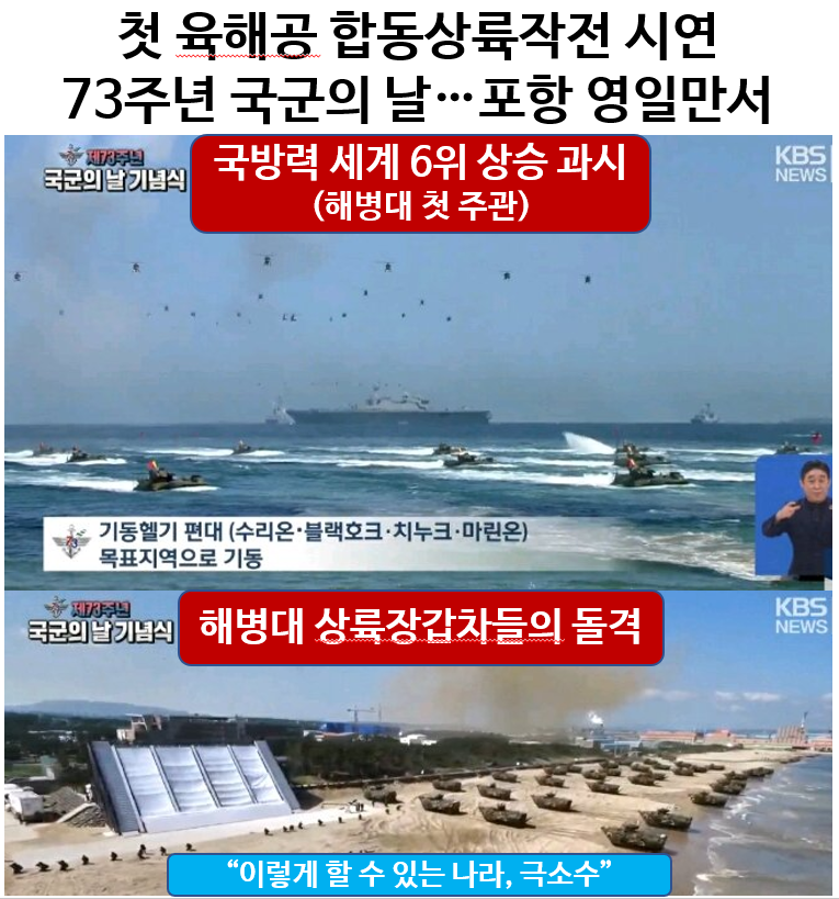 73주년 국군의날, F-35A(스텔스기)등 입체 출격, 첫 육해공 합동상륙작전(해병대 주관)